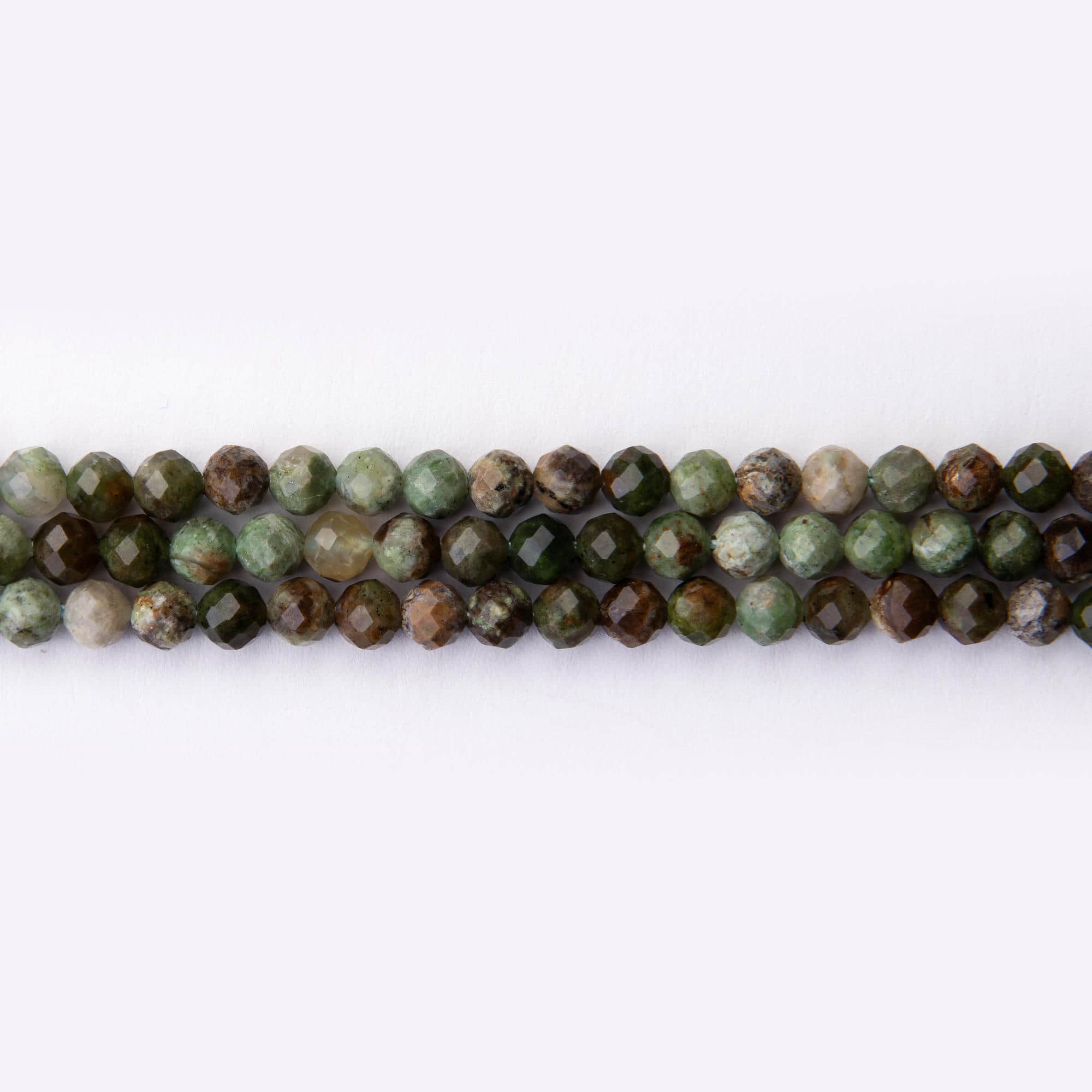 The Rhyolite Jasper Natural Stone 4mm Round Sparkling Faceted beads are an exquisite choice for jewelry-making enthusiasts seeking natural gemstones with both aesthetic beauty and energetic benefits. These 4mm round beads showcase a sparkling faceted surface that brilliantly catches and reflects light, enhancing the rich green and brown natural hues characteristic of Rhyolite Jasper. Their vibrant color blend and faceted texture make them ideal for crafting eye-catching necklaces, bracelets, earrings, and other accessories that stand out with subtle shimmer and organic charm.