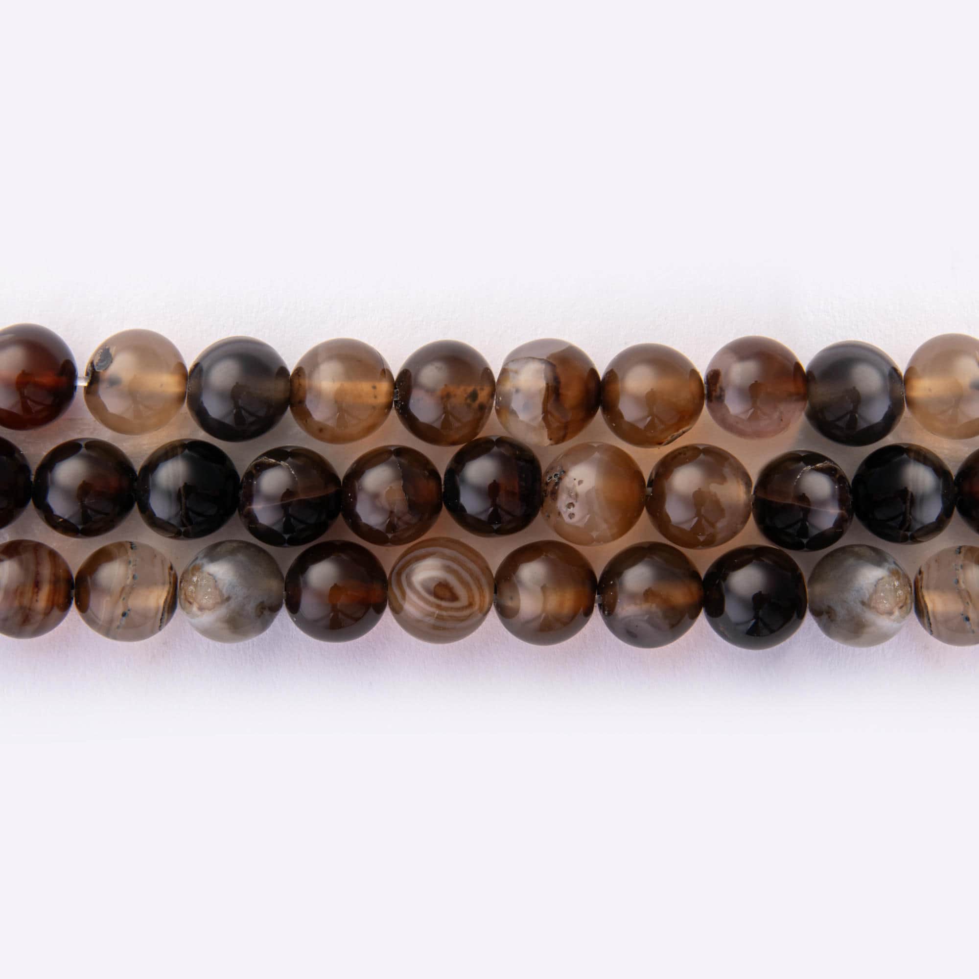 The Brown Agate Natural Stone 8mm Round Polished beads are an exquisite choice for gemstone enthusiasts and jewelry makers looking to enhance their creations with natural beauty and grounding energy. These high-quality natural gemstones feature a smooth, polished surface that highlights their distinctive color palette, blending shades of black, brown, grey, and cream. The classic 8mm round shape makes these stones versatile and ideal for various jewelry designs, including bracelets, necklaces, and earrings. Sold by the strand, each set contains 49 beads, weighing 35.4 grams, perfect for crafting elegant and unique pieces.