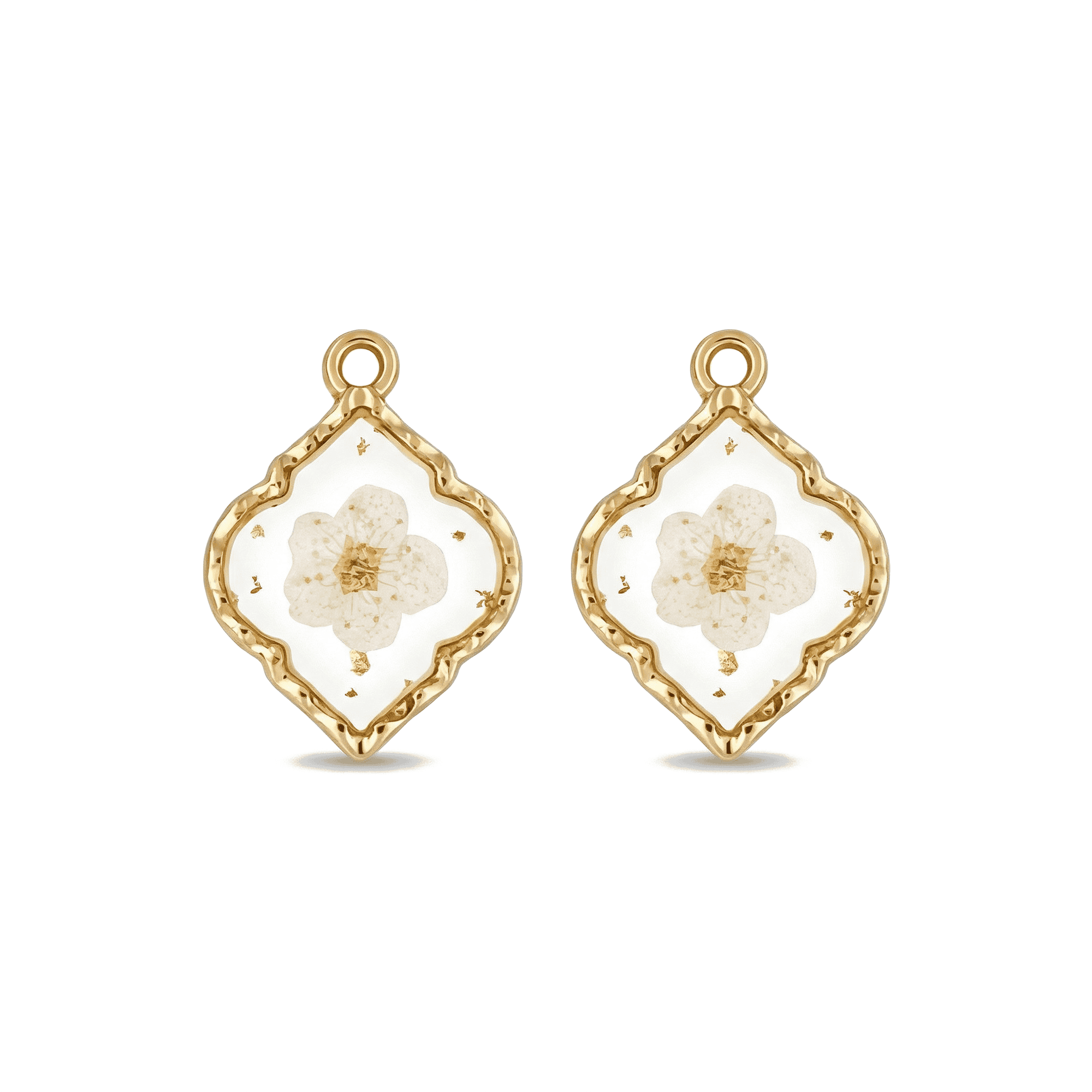 These cream dried natural flower resin charms showcase delicate real petals preserved in crystal-clear resin, creating an elegant botanical accent for any jewelry piece. Each 16×22mm charm is set against a luxurious 18K gold-plated copper backing, providing both durability and a radiant finish. The smooth, polished surface highlights the intricate floral details, while the compact size makes them perfect for adding a subtle, nature-inspired touch to earrings, necklaces, bracelets, keychains, and more.